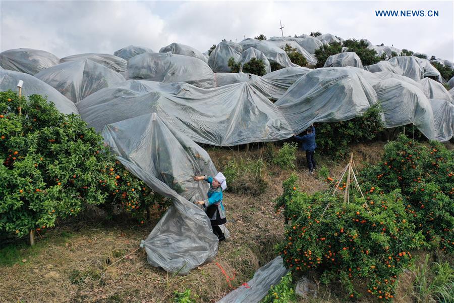 Aerial photo taken on March 9, 2020 shows villagers picking citrus fruit at a planting base in Guzhou Township of Rongjiang County, southwest China's Guizhou Province. The citrus planting bases in Rongjiang have organized villagers to harvest citrus fruit recently to resume market supply. The picking of the citrus fruit had been postponed due to the novel coronavirus outbreak, and the fruit were preserved on trees with film covered to keep warm and fresh. Now about 2 million kg of citrus fruit will be harvested to meet the market demand. [Xinhua/Yang Ying]